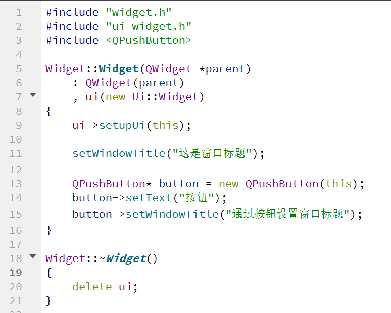 } 这段代码创建了一个 Qt 应用程序对象QApplication,实例化了自定义的Widget(继承自QWidget),并通过show()方法显示窗口,最后通过exec()进入应用程序的事件循环。