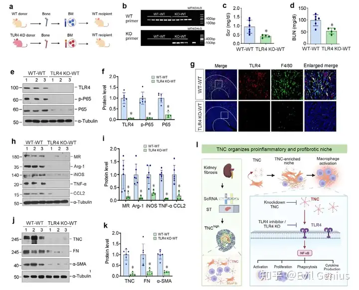 内源性TNC通过招募并激活TLR4⁺巨噬细胞,驱动局部炎症反应与纤维化进程,证实其在体内微环境调控中的关键作用。靶向TNC可同时抑制炎症与纤维化,为肾脏疾病治疗提供了双重干预靶点。