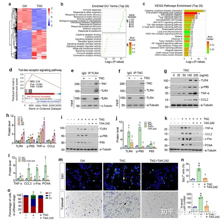 TNC通过直接结合并激活巨噬细胞表面的TLR4受体,启动NF-κB信号级联反应,特异性驱动巨噬细胞的增殖、活化、迁移及炎症因子释放,揭示了ECM蛋白作为损伤相关分子模式介导免疫应答的新机制。