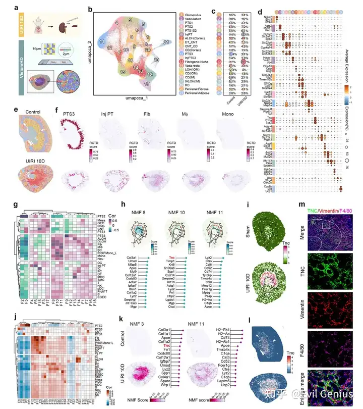 其中因子11反映巨噬细胞特异性基因,而作为因子10核心成分的腱生蛋白C(Tnc) 表现出与成纤维细胞-巨噬细胞微环境的强烈共定位(图2g-h)。Visium HD数据的非负矩阵分解进一步验证了上述发现(因子3:成纤维细胞相关;因子11:巨噬细胞相关)。