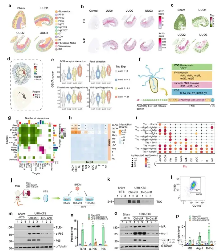 尽管UUO模型诱导的纤维化主要位于内髓外带-内髓交界处(与UIRI模型偏好皮质髓质交界处不同),但该区域同样呈现成纤维细胞-巨噬细胞共定位现象,并保留保守的TNC空间分布模式。