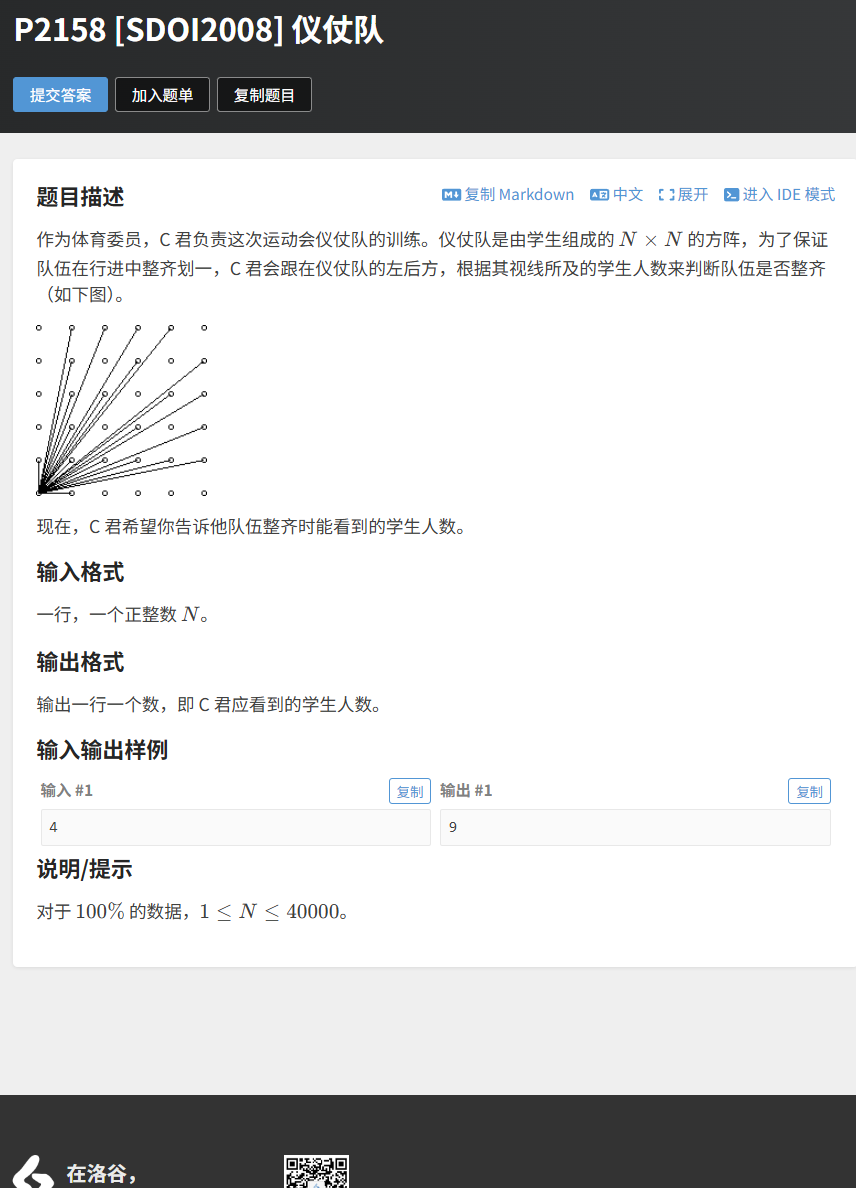 题目描述:仪仗队是由 N×N 的学生组成的方阵,C 君站在方阵的左后方(坐标 (0,0)),视线沿直线延伸。当且仅当学生站在坐标 (i,j)(1≤i,j≤N)且 i 和 j 互质时,C 君才能看到该学生。求 C 君能看到的学生总数。