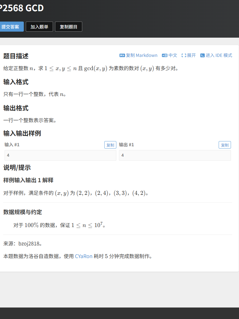 题目描述:给定正整数 n,求 1≤x,y≤n 且 gcd (x,y) 为质数的数对 (x,y) 的个数。