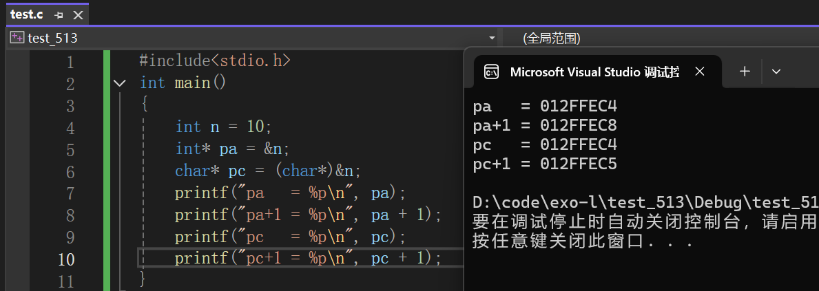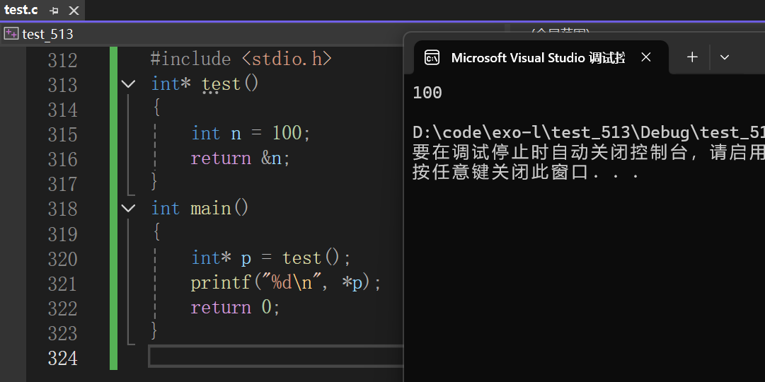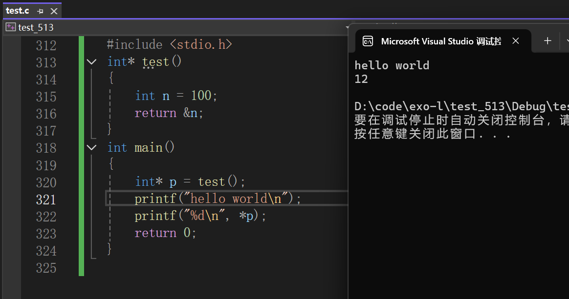 }这段代码是野指针成因中 “函数返回局部变量地址” 的典型例子,test 函数返回了局部变量 n 的地址(&n) 。当 test 函数执行完,n 的生命周期结束,其占用的内存被系统收回。但 main 函数中 p 却接收了这个地址,此时 p 指向的内存已无效,p 就成了野指针。后续对 *p 解引用操作时,访问的是不确定甚至已被重新分配的内存区域,可能得到错误数据,或引发程序崩溃、未定义行为等。 我们将这段代码运行起来:
