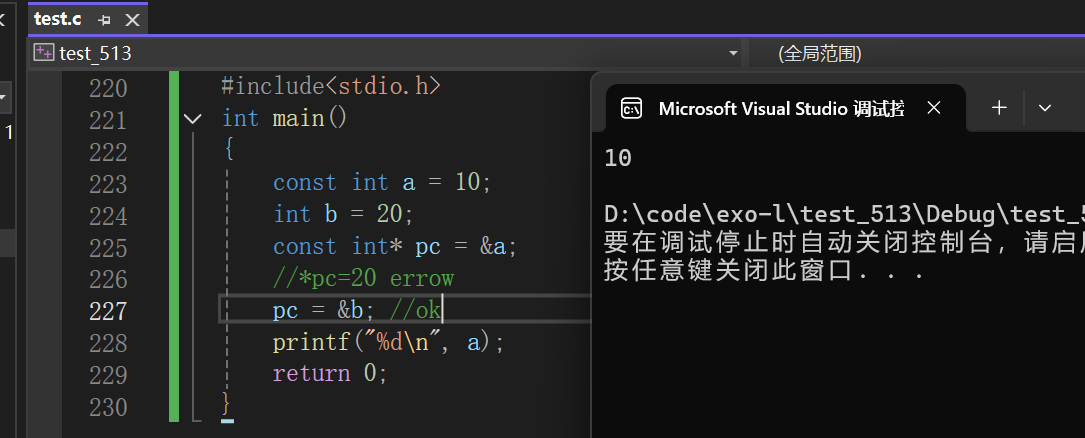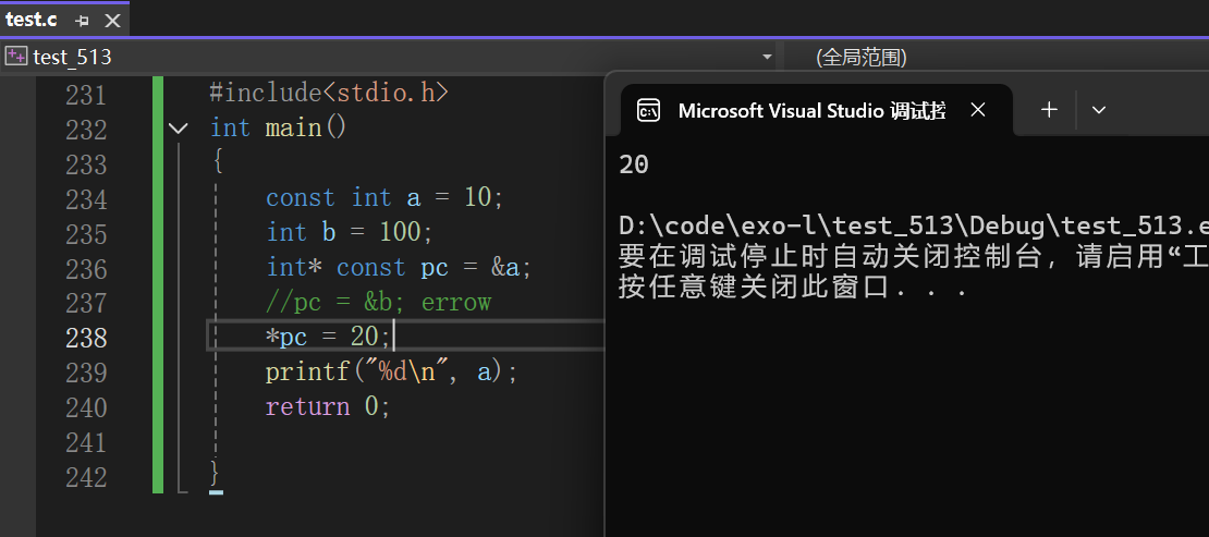结论:const修饰指针变量的时候const可以放在*右边,const限制的是pc,也就是pc的指向对象不能改变了,但是*pc不受限制,也就是说pc指向的内容,可以通过pc来改变。