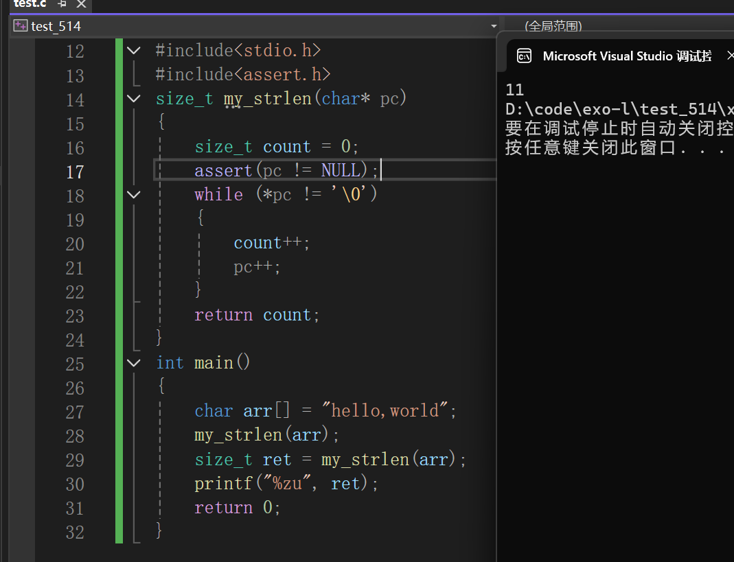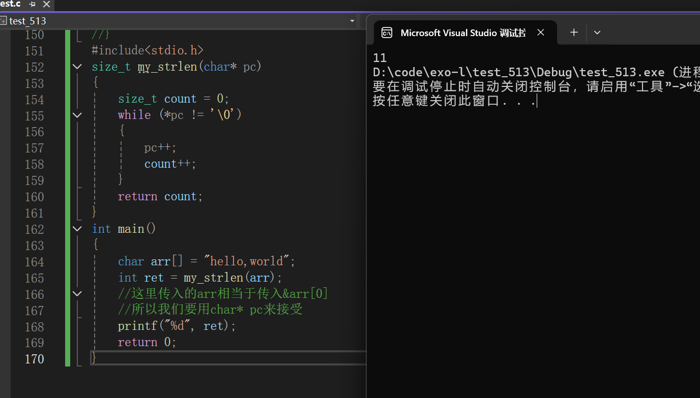 这串代码很好的帮我们解决了这个问题,但是我们还会想到既然指针-指针得到的是俩指针之间的元素个数,我们可不可以用指针-指针的方式来实现呢?这当然是可以的。