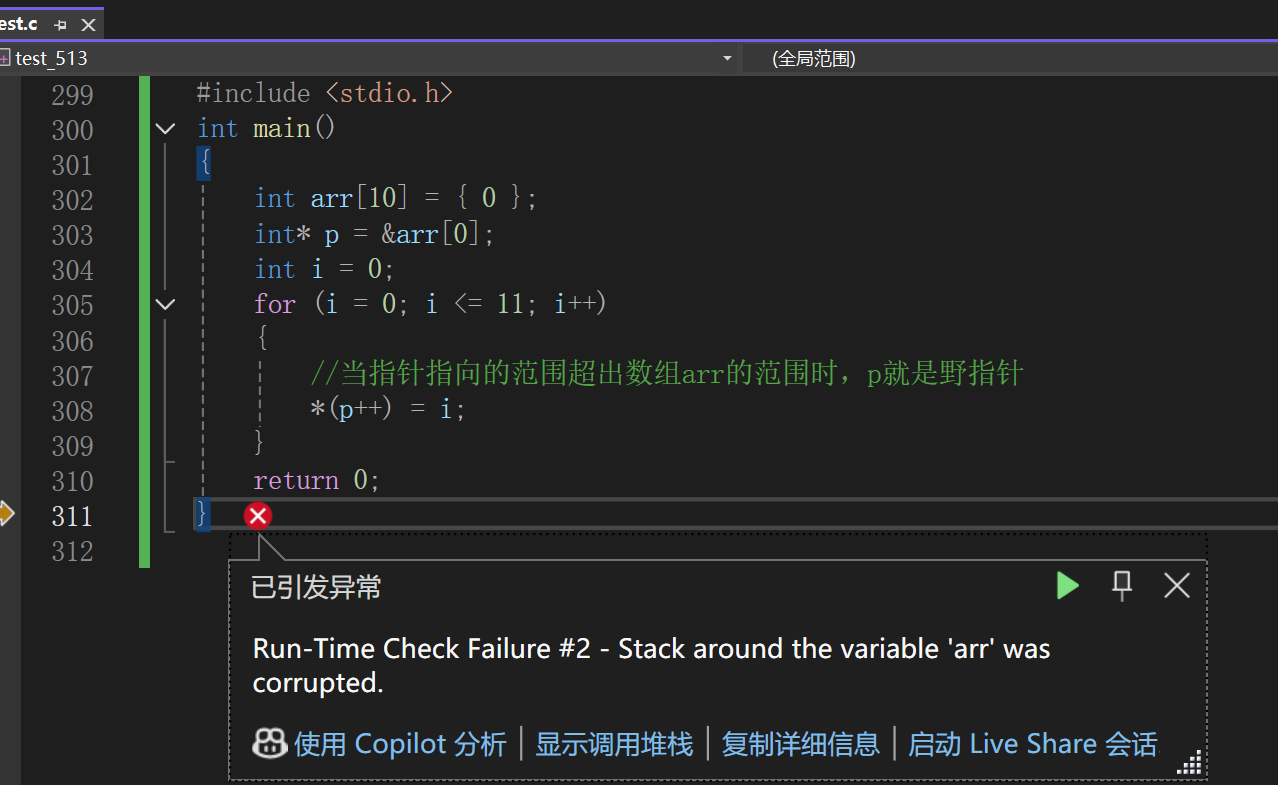 概念:野指针就是指针指向的位置是不可知的(随机的、不正确的、没有明确限制的) 说的通俗一点就是指针指向的空间是不属于当前程序的。