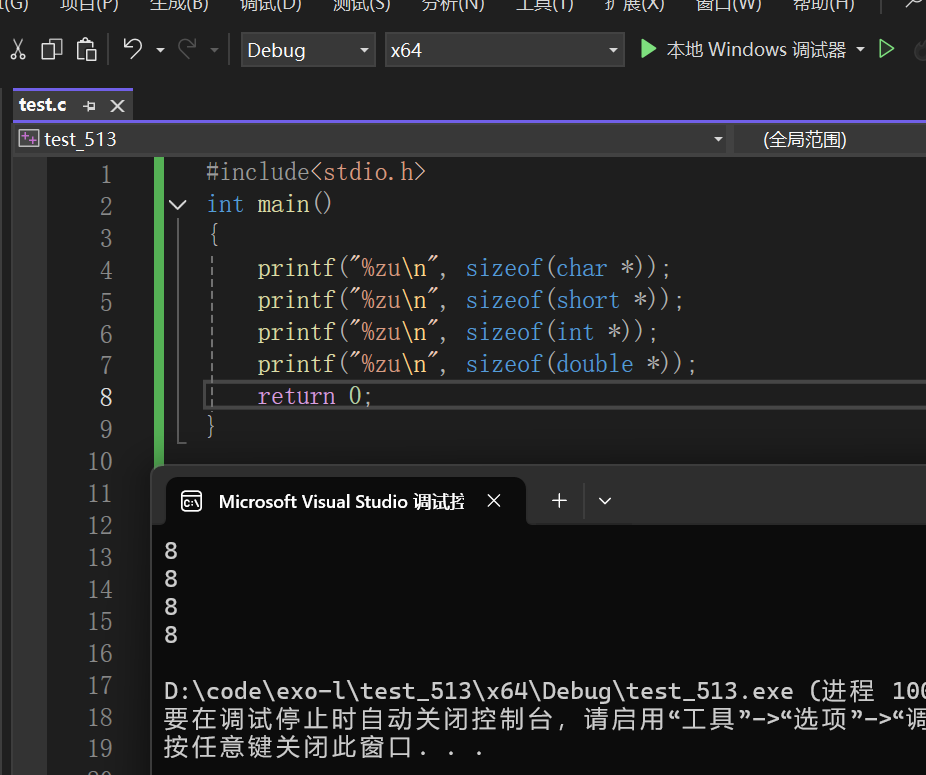 我们这时候就可以发现三个结论: 1、32位平台下的地址是32个bit位,指针变量的大小是4个字节。 2、64位平台下的地址是64个bit位,指针变量的大小是8个字节。 3、指针变量的大小和类型是无关的,只要指针类型的变量,在相同平台下,大小都是相同的。