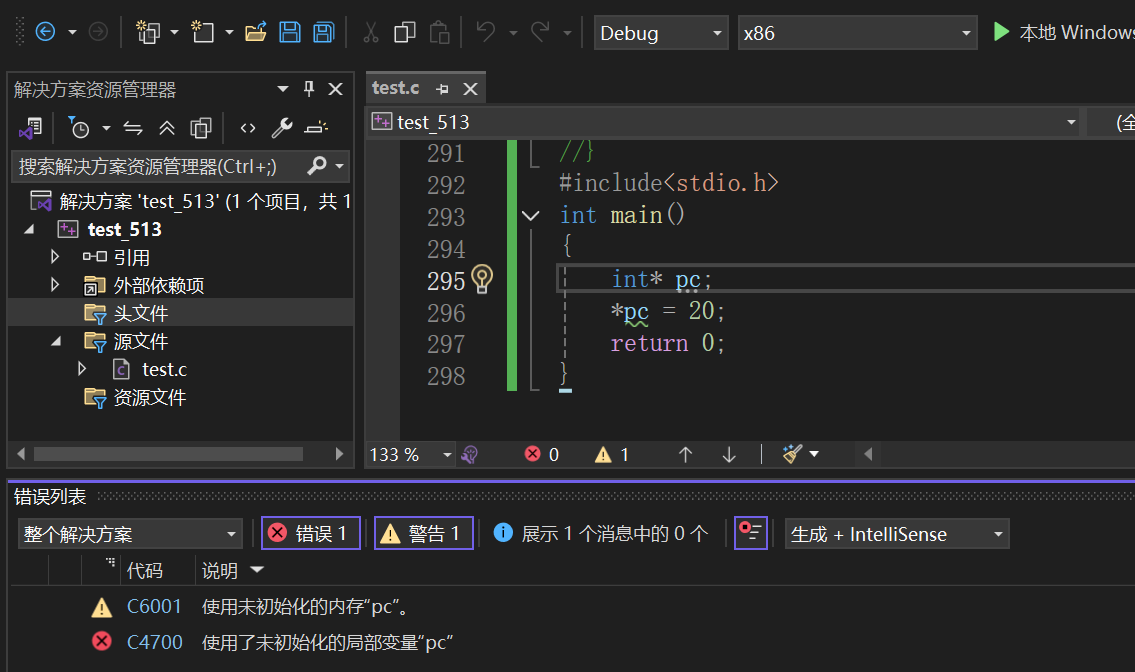 这里我们可以看出代码发出了警告,是因为pc是局部变量,局部变量指针未初始化,默认是随机值。