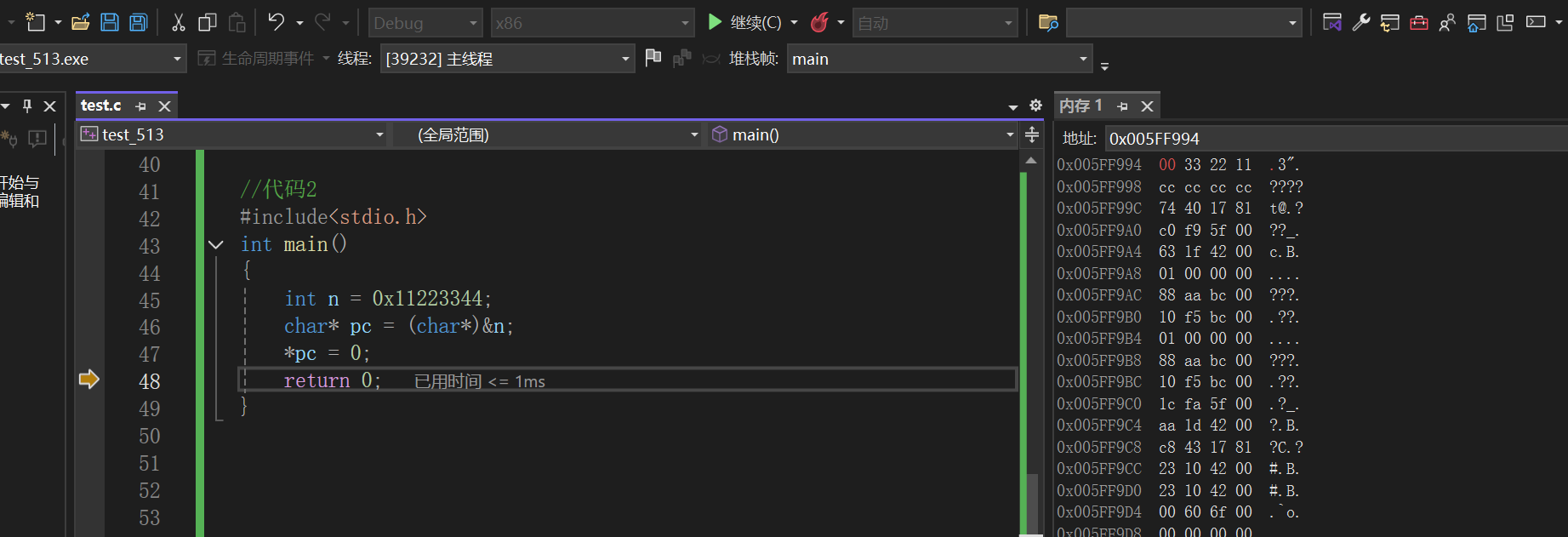 }我们对上述俩段代码分别调试便可以看到:代码1会将n的四个字节全部改为0;但是代码2只是将n的第一个字节改为0。