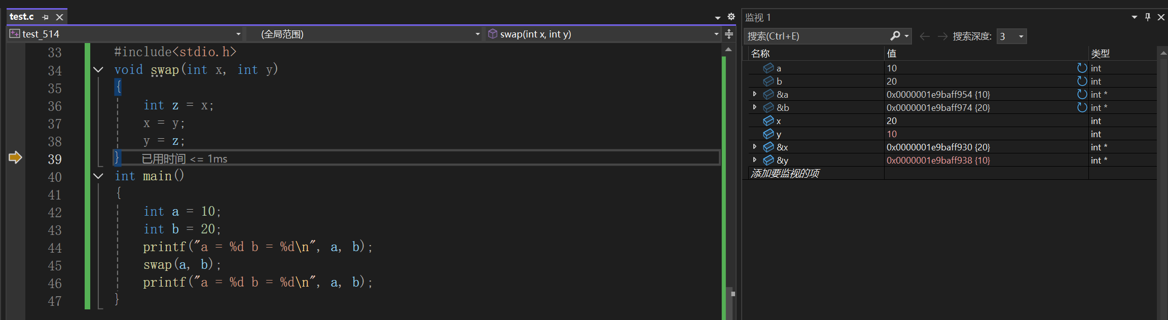 我们发现在main函数内部,创建了a和b,a的地址是0x0000001e9baff954,b的地址是0x0000001e9baff974,在调用swap函数时,将a和b传递给了swap函数,在swap函数内部创建了形参x和y接收a和b的值,但是x的地址是0x0000001e9baff930,y的地址是0x0000001e9baff938,x和y确实接收到了a和b的值,不过x的地址和a的地址不一样,y的地址和b的地址不一样,相当于x和y是独立的空间,那么在swap函数内部交换x和y的值,自然不会影响a和b,当swap函数调用结束后回到main函数,a和b的没法交换。swap函数在使用的时候,是把变量本身直接传递给了函数,这种调用函数的方式我们之前在函数的时候就知道了,这种叫传值调用。