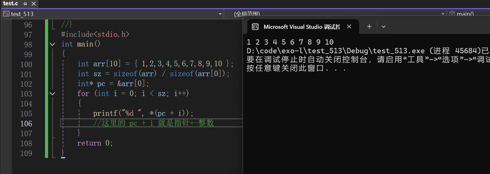 当 i = 0 时,pc + 0 还是指向 arr[0] ,*(pc + 0) 就等同于 *pc ,取出 arr[0] 的值。