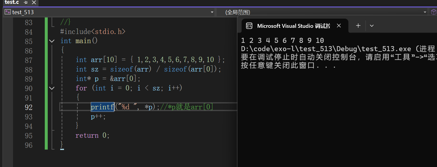 我们利用上述学的知识找到arr[0]的地址,然后不断让p++,这里的p+1就相当于他向前走了四个字节。(指针变量存储的是内存地址。对于指向数组元素的指针(这里 p 指向 arr 数组首元素),p++ 会使指针指向下一个数组元素的内存地址。在 C 语言中,指针自增的步长取决于它所指向的数据类型。这里 p 是 int * 类型指针,指向 int 型数据,int 在常见系统中占 4 字节(32 位系统)或 8 字节(64 位系统),p++ 会让指针的地址值增加相应字节数(如 4 字节或 8 字节 ),指向下一个 int 元素。在代码的 for 循环中,每次执行 p++,p 就会从指向当前数组元素变为指向下一个数组元素。循环首次执行时,p 指向 arr[0] ,执行一次 p++ 后,p 指向 arr[1],再执行一次 p++,p 指向 arr[2],依此类推,从而实现通过指针遍历数组元素,配合printf("%d ",*p) 语句依次输出数组每个元素的值。)