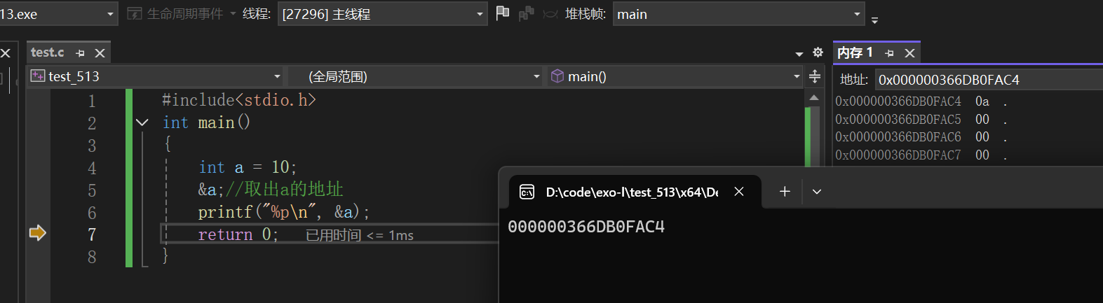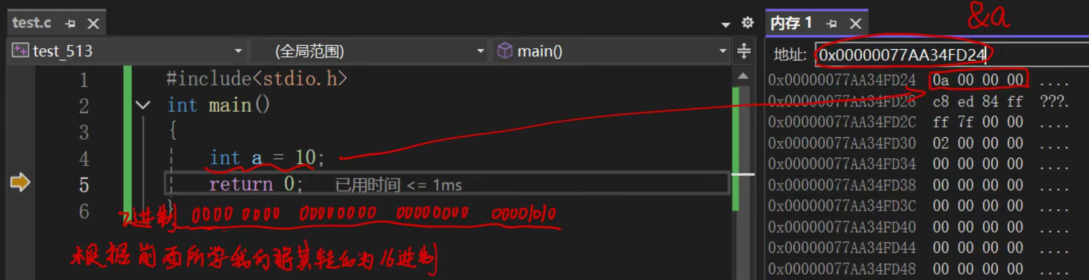 上述的代码就是创建了整型变量a,内存中申请4个字节,用于存放整数10,其中每个字节都有地址,上图中4个字节的地址分别是:0x00000077AA34FD24、0x00000077AA34FD25、0x00000077AA34FD26、0x00000077AA34FD27。 那我们如何能够得到a的地址呢?这时候我们就需要学习一个操作符--&(取地址操作符)。