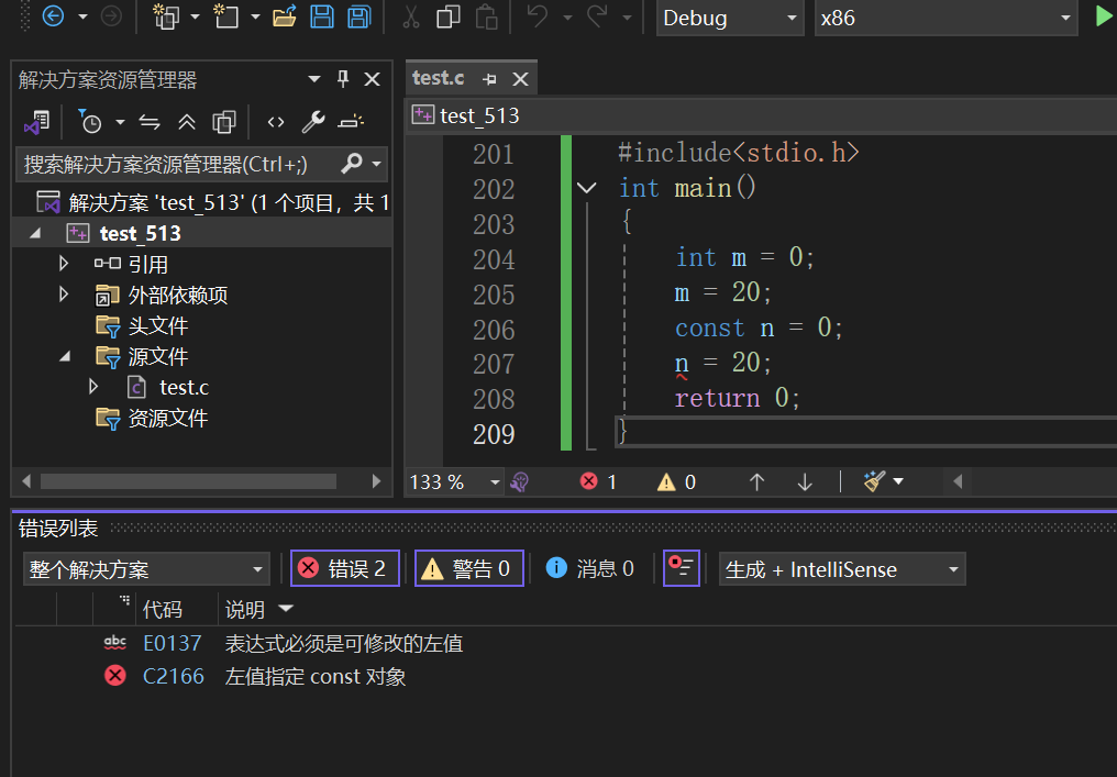 这里我们来学习一个新的关键字--const,我们直接来说const的作用:用于限定一个变量为只读,即不能通过直接修改该变量来改变其他变量。