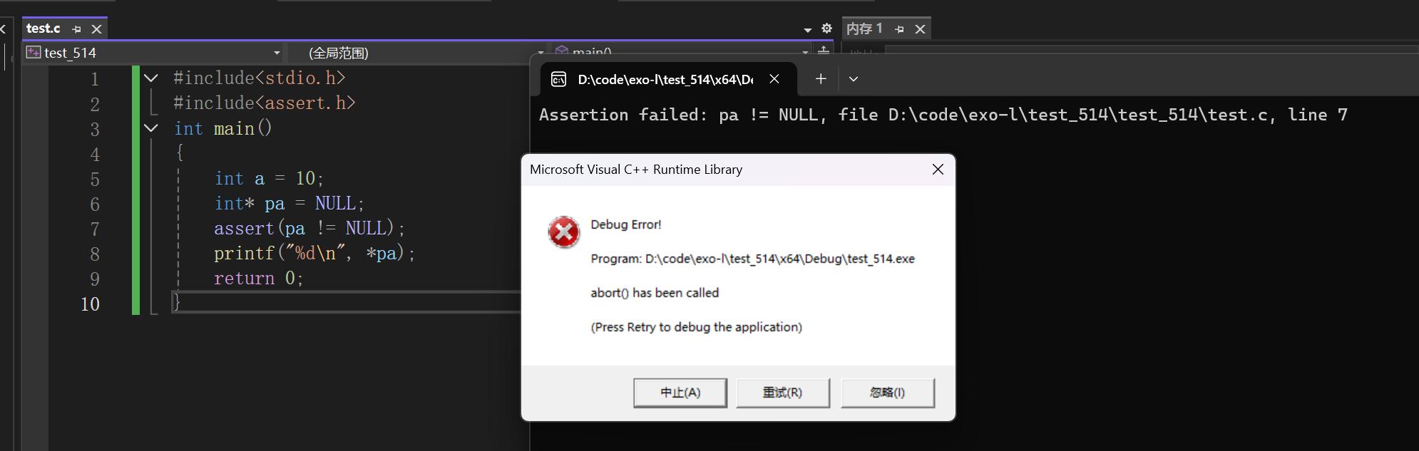 assert(p != NULL);上面代码在程序运行到这一行语句时,验证变量 p 是否等于 NULL 。如果确实不等于 NULL ,程序继续运行,否则就会终止运行,并且给出报错信息提示。assert( ) 宏接受一个表达式作为参数。如果该表达式为真(返回值非零),assert( ) 不会产生任何作用,程序继续运行。如果该表达式为假(返回值为零),assert( )就会报错,在标准错误流stderr中写入一条错误信息,显示没有通过的表达式,以及包含这个表达式的文件名和行号。