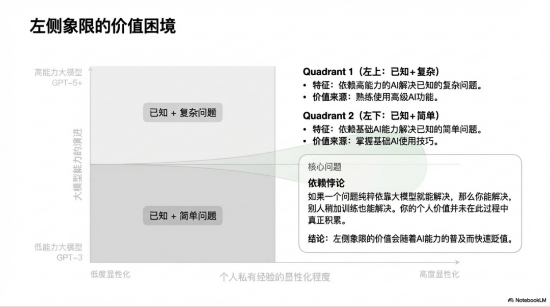 举个例子,你可能比别人早半年学会了如何用Claude写代码,或者提示词写得更精准更有效。但这种优势本质上只是时间差和信息差。当大模型能力持续提升,当越来越多人掌握基础的AI使用技巧,你的这种领先优势会迅速归零。在左侧象限解决问题,存在一个根本性的悖论:如果一个问题纯粹依靠大模型就能解决,那么你能解决,别人稍加训练也能解决,你的个人价值并没有在这个过程中得到真正的积累和沉淀。