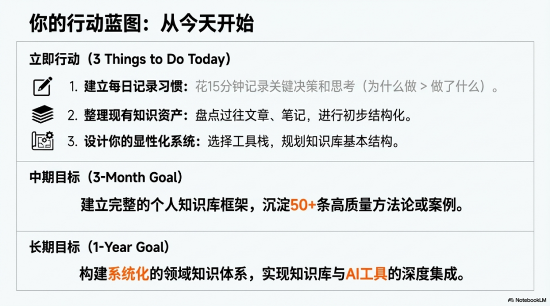 如果你认同这个框架,那么立即可以开始做三件事。第一件事是建立每日记录习惯,每天花十五分钟记录今日的关键决策和思考,重点记录为什么这样做而不只是做了什么,使用统一的知识管理工具比如Obsidian或Notion。