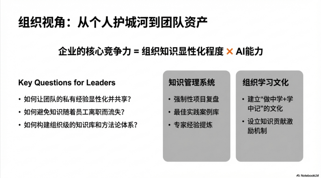 虽然本文聚焦个人成长,但这个框架同样适用于组织层面。企业的核心竞争力,本质上等于组织知识显性化程度乘以AI能力。这里的关键问题是,如何让团队的私有经验显性化并共享,如何避免知识随着员工离职而流失,如何构建组织级的知识库和方法论体系。