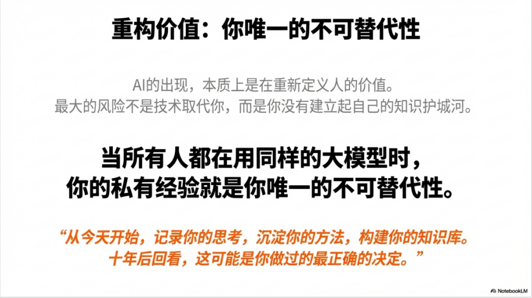 更关键的是,这种显性化的私有经验是AI无法平权的。因为它来自你独特的实践场景、行业洞察和失败教训,这些都无法通过简单的提示词工程获得。别人可以用同样的大模型,但无法复制你多年积累的经验库,更无法复制这些经验背后的深层认知和判断框架。