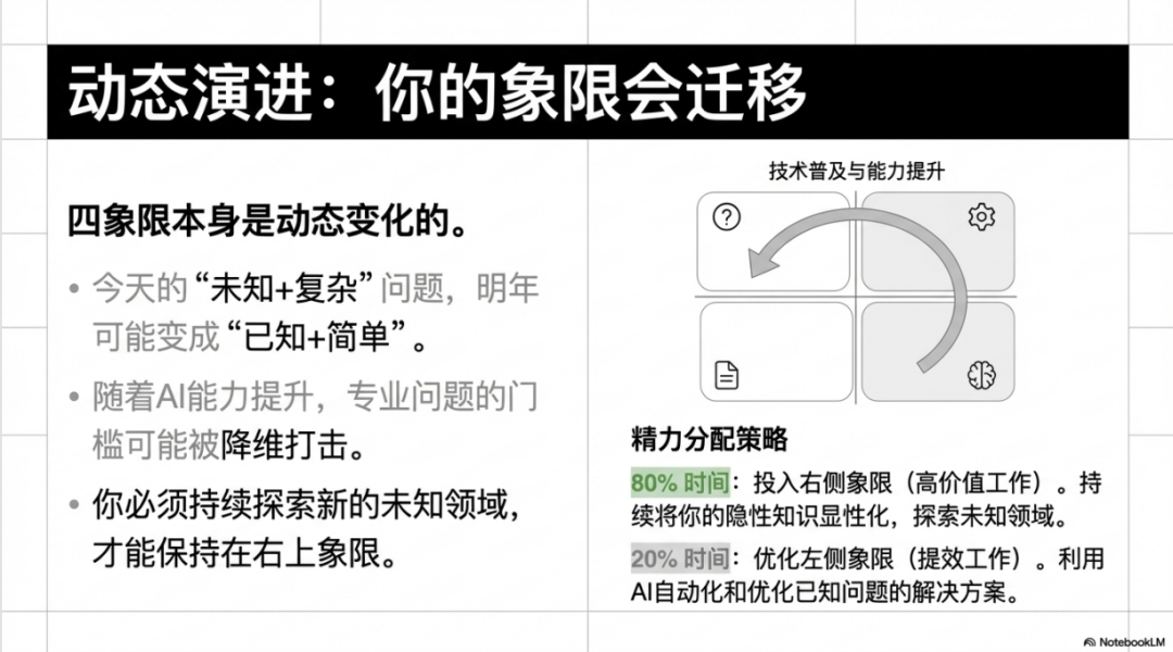 同时,这个框架不是要你完全放弃左侧象限,而是要建立合理的精力分配策略。对于左侧象限的问题,应该用AI快速处理,释放时间。把标准化流程自动化,把常规问题模板化,把重复性工作AI化。而对于右侧象限,要集中精力深耕,在复杂问题上进行深度思考,持续沉淀私有经验,系统构建方法论。