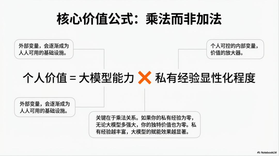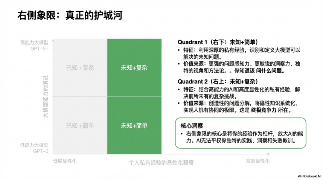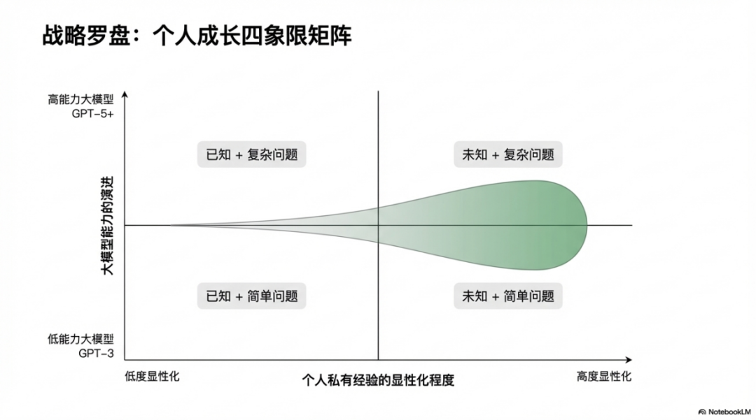 注意这里是乘法而不是加法。这意味着如果私有经验为零,无论大模型多强大,你的独特价值也是零。而私有经验越丰富,大模型对你的赋能效果就越显著。这就是为什么说右上象限才是真正的价值高地,因为这里的能力是复合型的,是难以被简单模仿和替代的。
