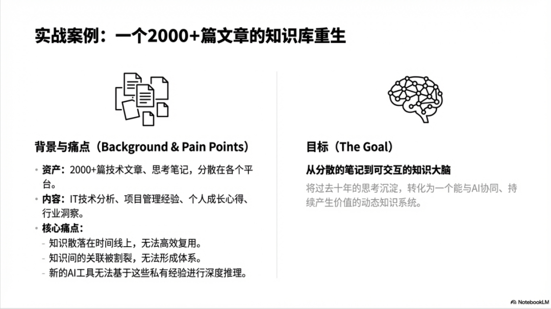 核心痛点是显而易见的。这些知识只存在于过去的时间线上,无法高效复用。想要找到某个观点或方法,需要翻遍大量文章。知识之间的关联性被割裂,无法形成体系。更重要的是,新的AI工具无法基于这些私有经验进行深度推理。这就像是坐拥金矿却无法开采一样。