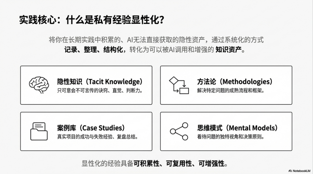 在AI时代,显性化的私有经验具有三重价值。首先是可积累性,每一次实践都在强化你的知识库,形成复利效应。其次是可复用性,同类问题可以快速调用已有经验和方法。第三是可增强性,AI可以基于你的知识库进行推理和创新,而不是从零开始。