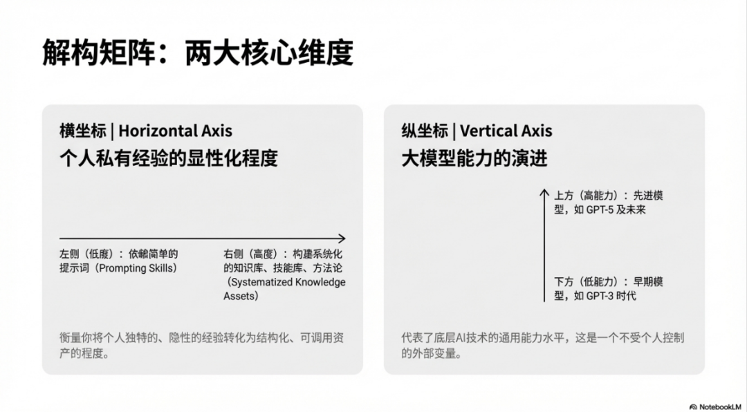这个四象限矩阵由两个坐标轴构成。横坐标代表个人私有经验的显性化程度(提示词工程,Skills技能库),左侧是低度显性化,主要依赖简单的提示词能力,右侧是高度显性化,已经构建起系统化的知识库、技能库和方法论体系。纵坐标代表大模型能力的演进,下方是类似GPT-3时代的低能力大模型,上方是GPT-5及以后的高能力大模型。