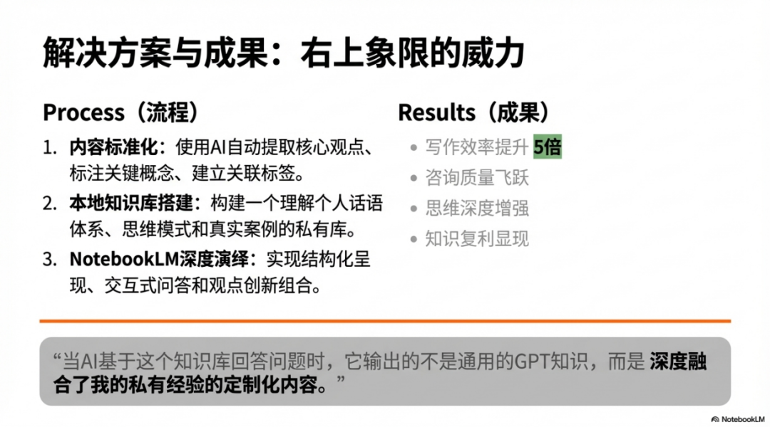 当AI基于这个知识库回答问题时,它输出的不是通用的GPT知识,而是深度融合了我的私有经验的定制化内容。这就是私有经验显性化的终极力量。具体效果是显著的,写作效率提升了五倍,可以快速检索和引用过往观点。咨询质量实现飞跃,能迅速调用相关案例和方法论。思维深度也得到增强,AI帮助我发现不同时期观点的演进和矛盾。最重要的是知识复利开始显现,每一次新输入都在强化整个知识体系。