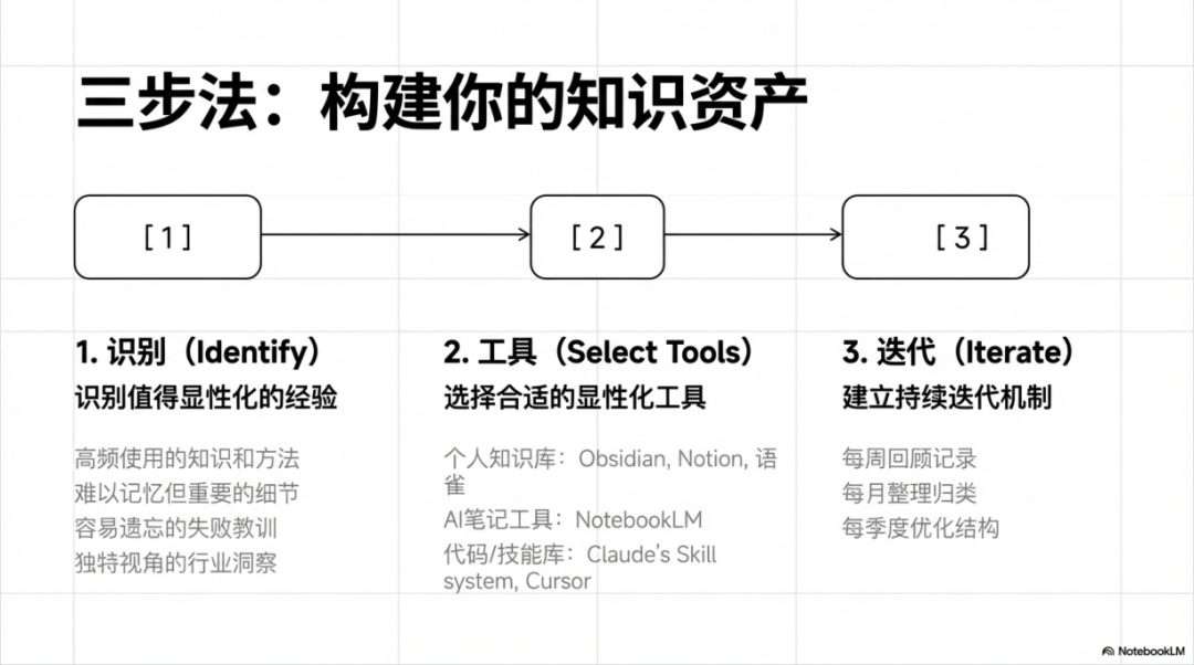 其次要选择合适的显性化工具。个人知识库可以用Obsidian、Notion或语雀等工具,代码知识库可以通过ClaudeCode或Cursor构建本地项目,AI笔记工具如NotebookLM可以帮助智能化整理,还可以构建类似Claude的Skill系统的个人技能库。