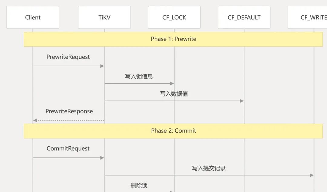 data列:存储事务写入的实际数据值。其Key的格式为 {用户row, 用户column, start_ts},Value是用户数据。这创建了一个由start_ts标识的、尚未提交的数据版本