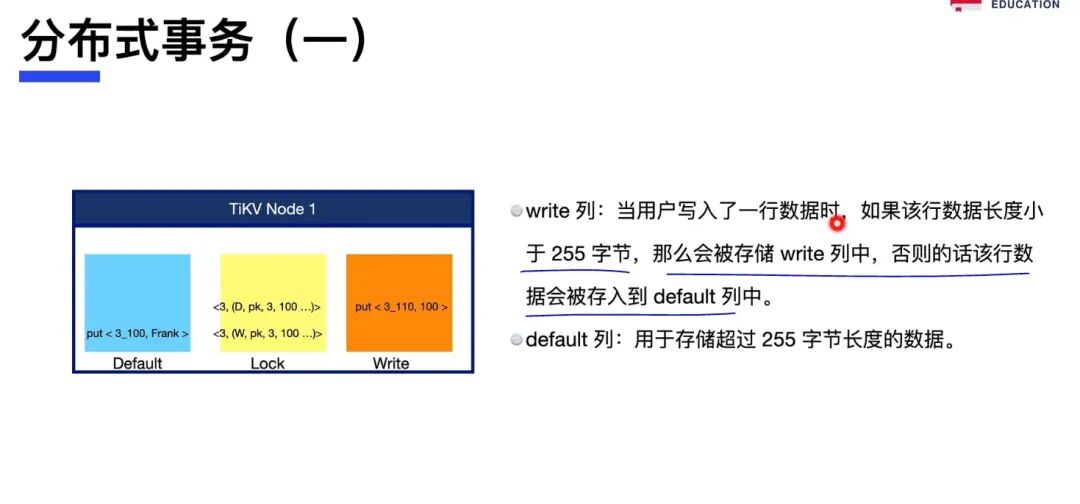 •write 列:用于存储用户真实的写入数据以及 MVCC 信息(该数据所属事务的开始时间以及提交时间)。当用户写入了一行数据时,如果该行数据长度小于或等于 255 字节,那么会被存储 write 列中,否则该行数据会被存入到 default 列中。由于 TiDB 的非 unique 索引存储的 value 为空,unique 索引存储的 value 为主键索引,因此二级索引只会占用 writecf 的空间。