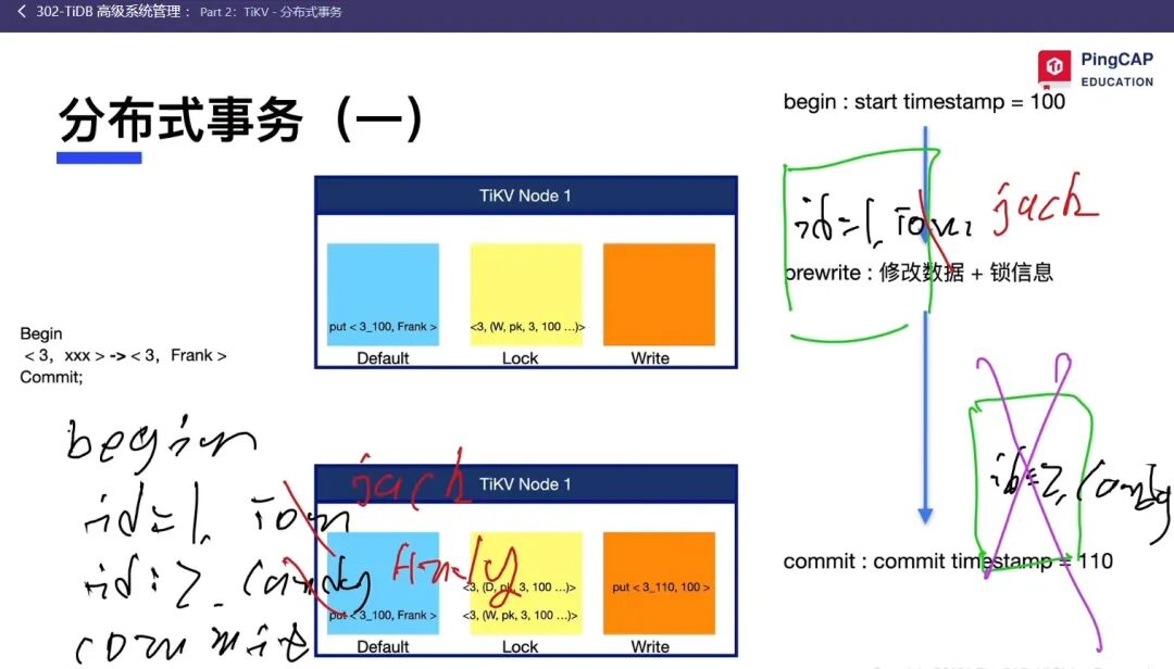 2、为分布式事务提供原子性基石:该设计完美契合了类似Google Percolator的分布式事务模型。在此模型中,全局唯一、单调递增的时间戳是协调事务状态(开始、提交、回滚)的核心。将start_ts和commit_ts编码到不同数据(如write列族)和锁(lock列族)的Key中,使得跨多行、多表的事务状态变更,可以通过对一组带有特定时间戳的Key进行原子操作来实现,这是构建跨节点一致性的直接且清晰的方式。