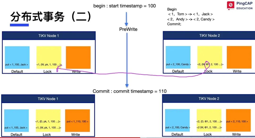 为了实现事务,它为每一行用户数据引入了三个特殊的“元数据列”(在TiKV中对应为lock, write, default 列族)