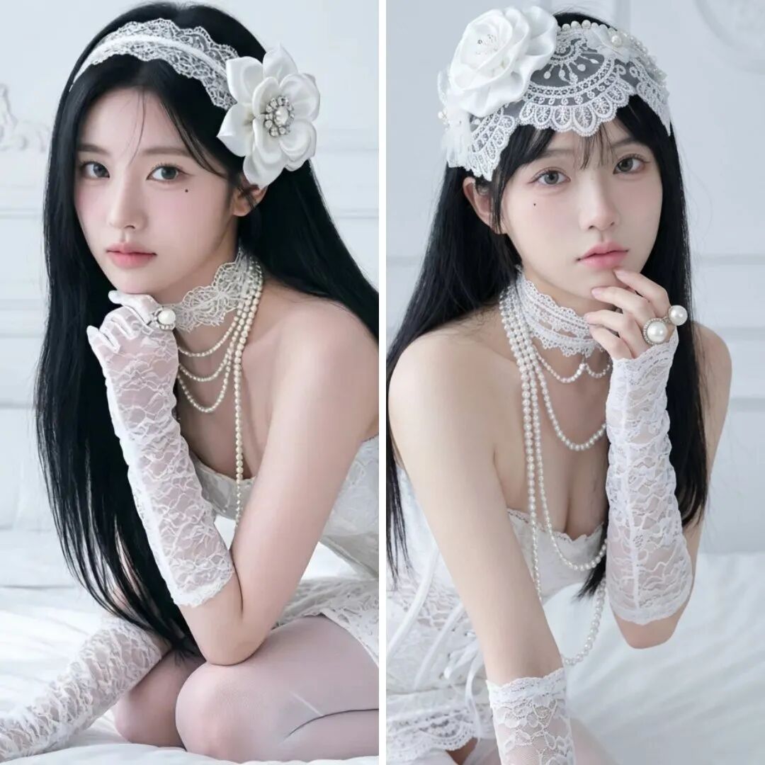 4 头饰:一枚白色花朵头饰(由缎面或类似光滑织物制成的花瓣,带有轻微的立体皱纹。花心点缀着小珠子或施华洛世奇水晶,增添一抹闪耀。额头上覆盖着精致的蕾丝,紧贴刘海