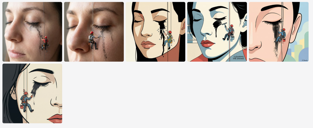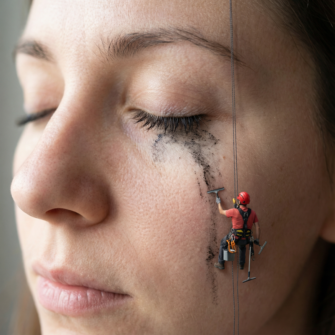 "scene_summary": "Ultra-photoreal surreal concept advertising image: extreme macro close-up of a woman's face with eyes closed, showing a dramatic smudged black mascara/eyeshadow streak running down her cheek like a stain. A tiny rope-access window cleaner / climber is scaling her cheek as if it were a giant wall, actively scraping and cleaning the mascara stain with a small squeegee and brush.\n\nThe mini climber is fully detailed and realistic: safety harness, ropes, carabiners, helmet (red), gloves, tool belt, and a small red bucket hanging from the harness. The ropes run vertically across the face, anchored out of frame, with believable tension and shadows. The climber’s scale is believable (miniature), with correct perspective and contact shadows on skin.\n\nSkin texture is hyper-realistic: pores, fine vellus hairs, subtle peach fuzz, natural highlights, and realistic makeup texture. The mascara smear has wet-to-dry texture variation with tiny flakes and glossy patches. The cleaner area shows a subtle 'wiped' path with different sheen, as if the stain is being removed.\n\nLighting: soft daylight from one side, creating gentle shadows that reveal skin texture and the climber’s depth; no harsh flash. Background is out of frame; only the face fills the composition. Mood: clever, premium, modern beauty ad concept, minimal yet striking."