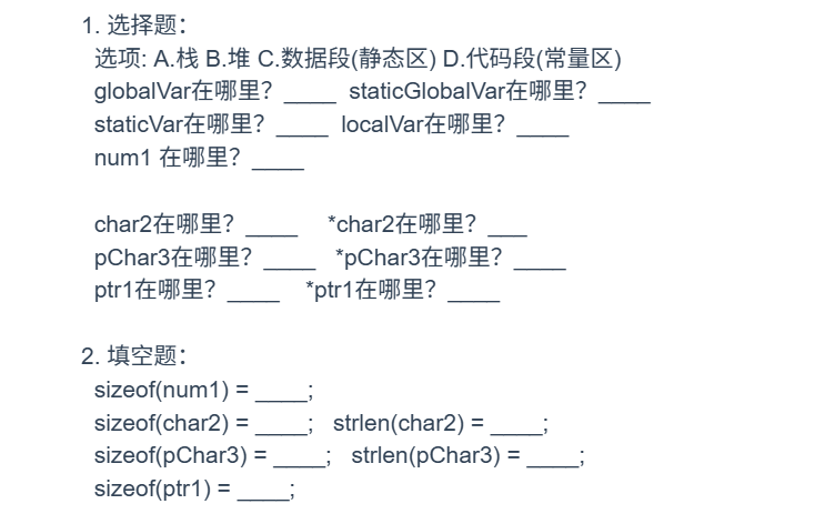 new/malloc申请的内存);手动分配 / 释放,空间大、灵活但需自行管理。static修饰);程序启动时分配,结束时释放。1、看下列代码,解决下列问题: