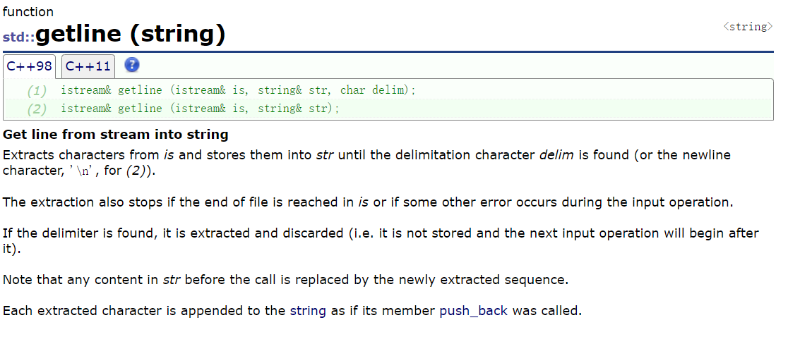 他并不是一个成员函数,而是输入流的全局函数 getline(istream&, string&)(定义在 <string> 头文件中),作用是从输入流中读取一整行内容,存入 string 对象。