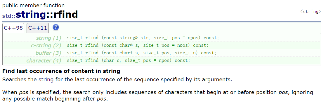 rfind(' ')从字符串末尾往前找第一个空格的位置;字符串总长度 - (空格位置 + 1)(因为空格的下一个位置是最后一个单词的开头);字符串总长度。下面我们写代码前再去简单了解一下rfind成员函数: