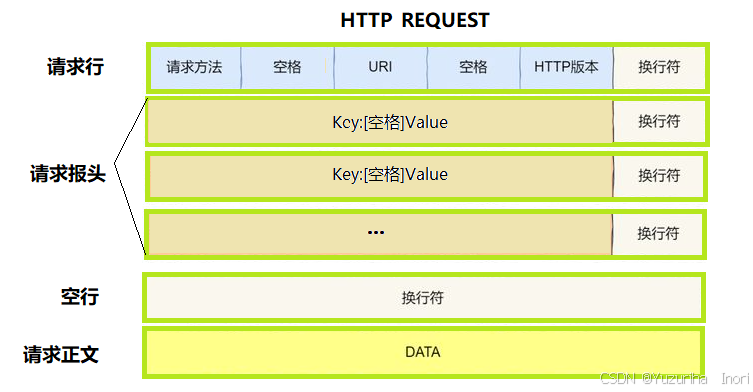 请求行:请求方法(GET) 空格 URI(资源地址) 空格 HTTP版本(HTTP/1.1) 换行符(\r\n)