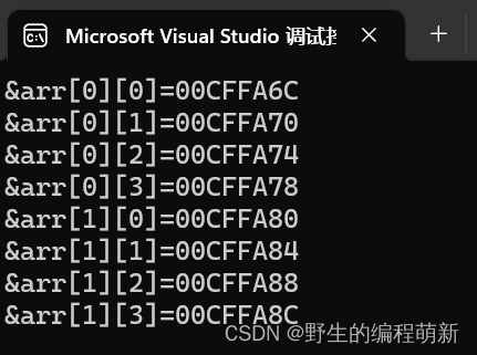 从输出的结果来看,每⼀⾏内部的每个元素都是相邻的,地址之间相差4个字节,跨⾏位置处的两个元素(如:arr[0][4]和arr[1][0])之间也是差4个字节,所以⼆维数组中的每个元素都是连续存放的。