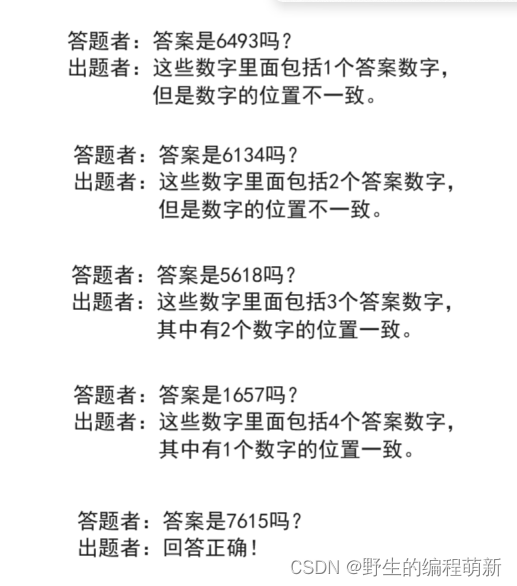 “珠玑妙算”是一个猜不重复的数字串的游戏,游戏的流程是:出题者根据答题者的推测给予提示,循环进行这种对话形式的处理,直到答题者猜对答案为止。出题者从0~9中选出4个数字,并将这4个数字排列成数字串作为题目。因为所有数字都不相同,所以不会出现“1123”这种出现重复数字的情况。下面是答案为“7615”时的游戏流程|: