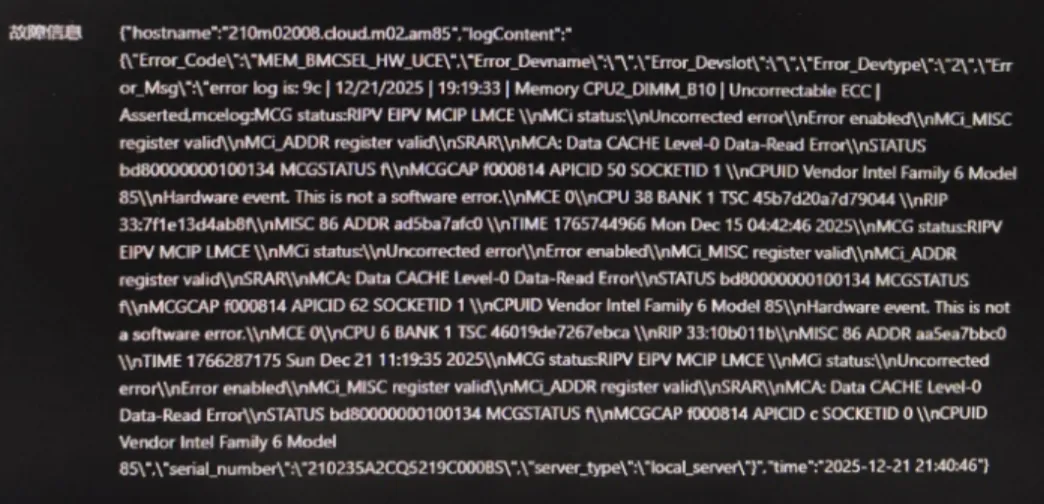 日志补充细节 后续内容是服务器硬件监控模块(MCE/MCG)记录的错误参数,包括: 错误来源:属于硬件错误(非软件错误) 涉及组件:CPU、内存缓存(CACHE Level 0)、内存地址等硬件模块 厂商信息:服务器 CPU 为 Intel(Family 6 Model 85)