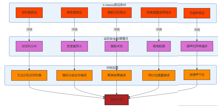 在实际安全数据中,K-Means的假设条件往往不成立,导致算法性能下降。具体冲突如下: