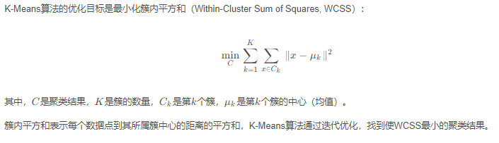 K-Means算法的核心思想是将相似的数据点分到同一个簇中,将不相似的数据点分到不同的簇中。其本质是一种基于距离的聚类算法,通过最小化簇内平方和(Within-Cluster Sum of Squares, WCSS)来实现聚类。