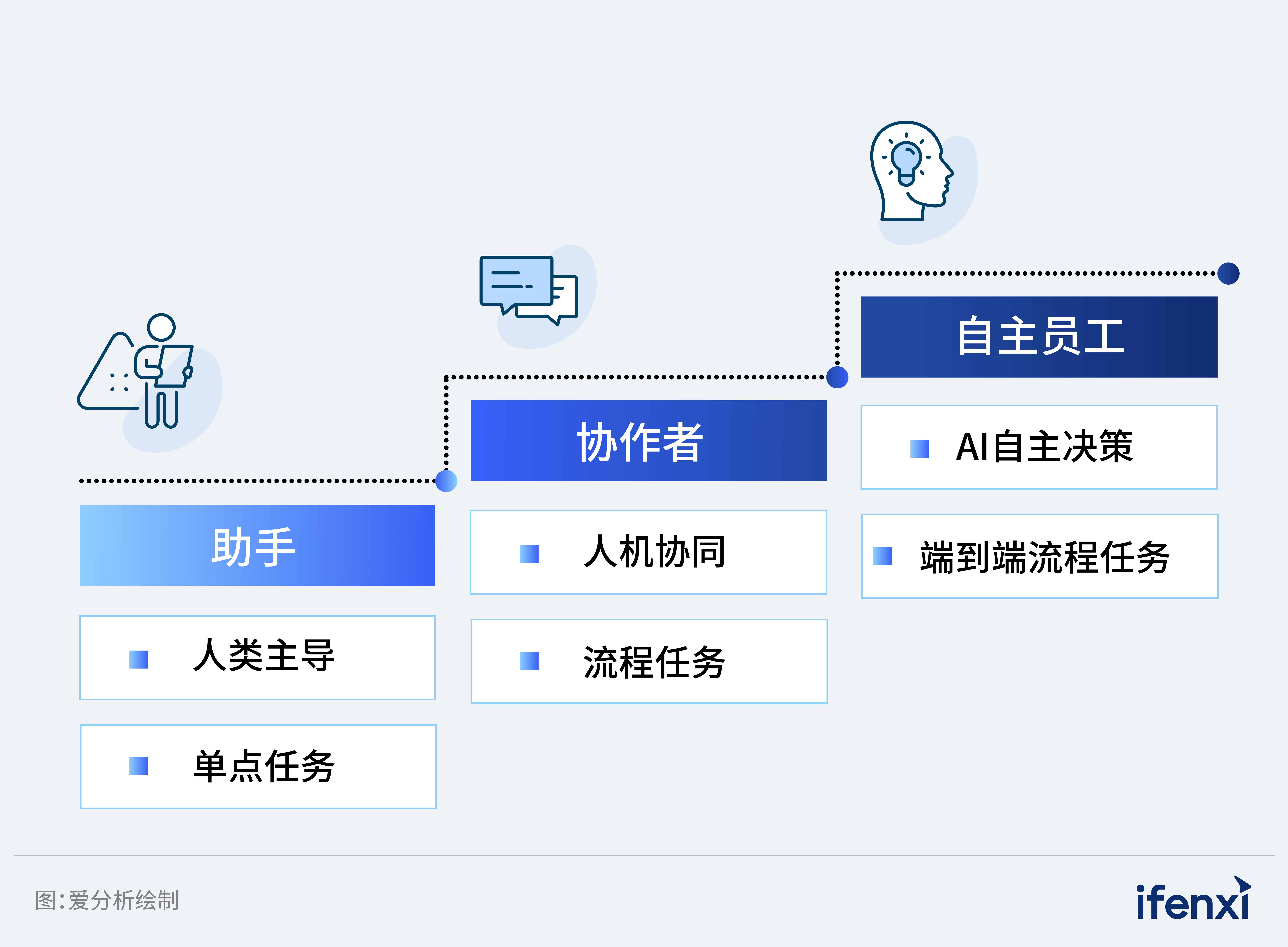 根据爱分析研究,Data Agent在企业落地呈现出清晰的三层演进路径,从助手到协作者、再到自主员工。层次越高,数字员工的自主决策能力越强,完成的任务流程越长、复杂度越高。