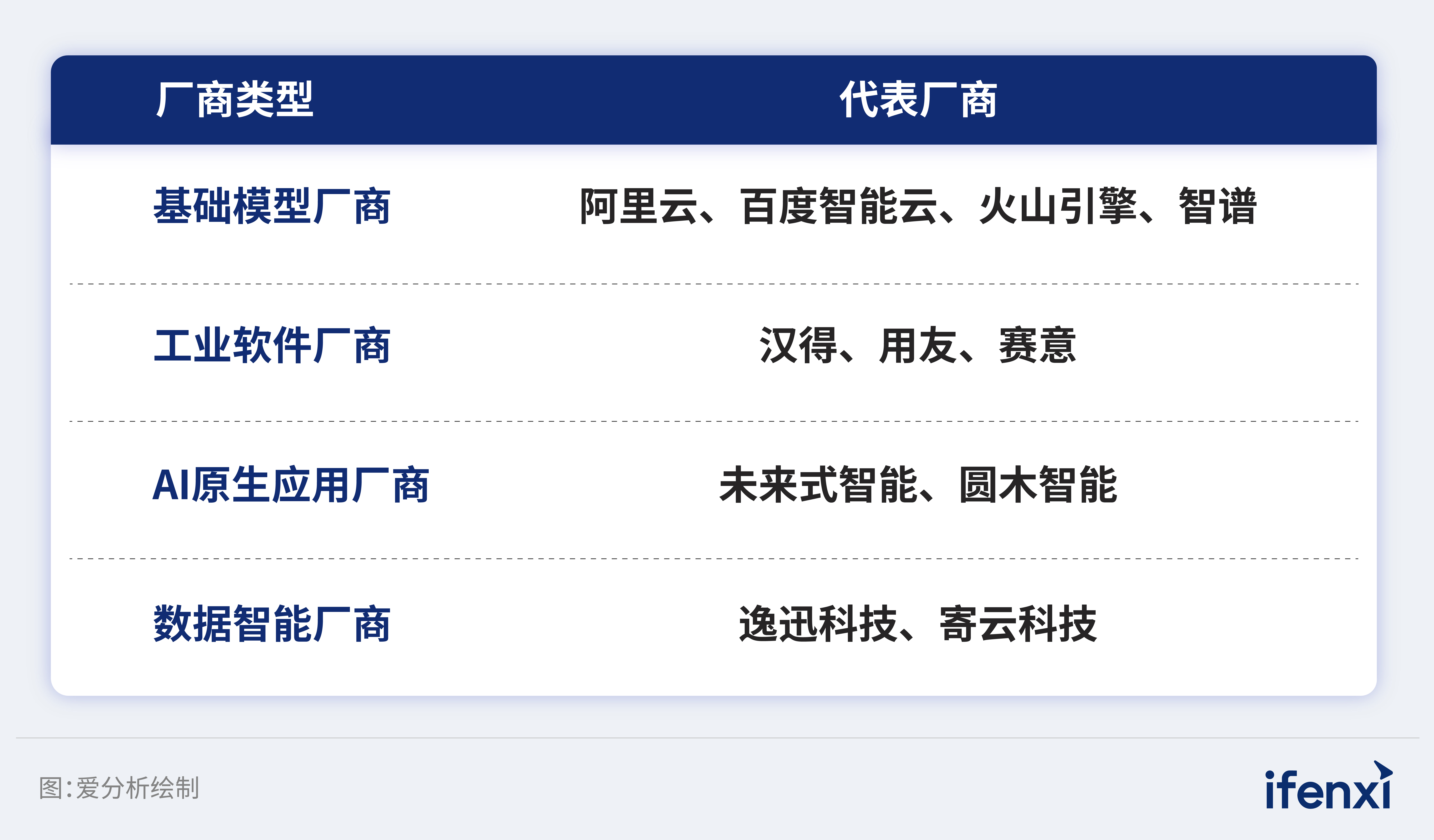 装备制造供应链智能体市场主要是四类技术厂商,分别是基础模型厂商、工业软件厂商、数据智能厂商和AI原生应用厂商。