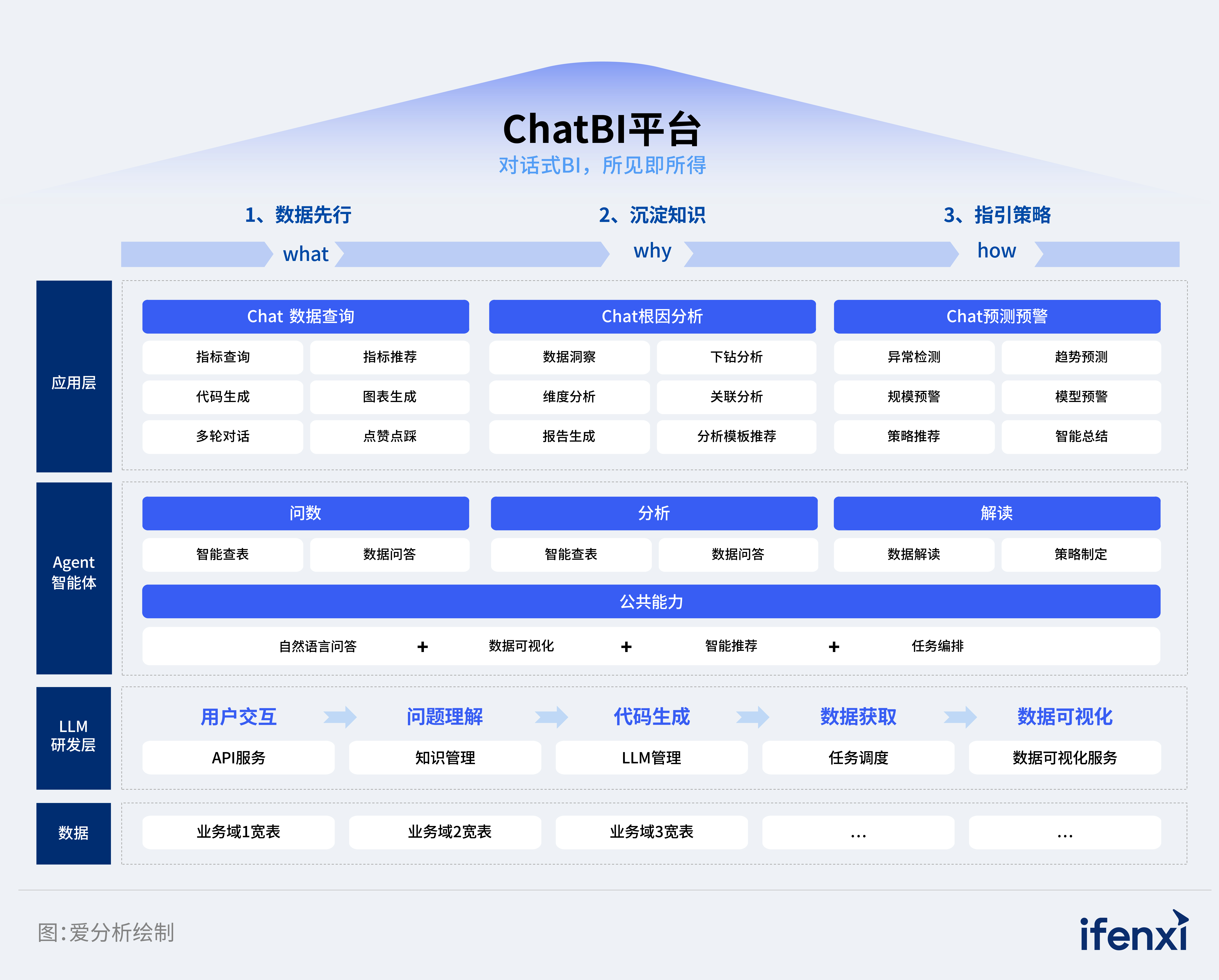 数据先行 (What)是Chat数据查询。 用户通过自然语言进行指标查询和多轮对话。Agent 能够自动完成代码生成与图表生成,快速回答“业务现状是什么”的问题 。