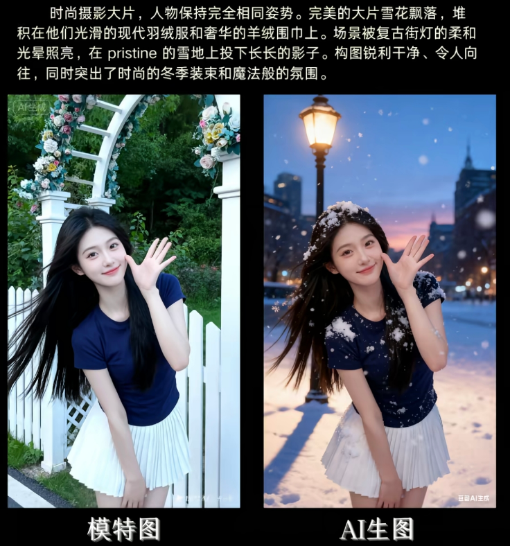 - 提示词示例:「复古港风,80年代香港街头,穿着复古连衣裙的女性漫步,背景有老式招牌和霓虹灯,暖黄色调,胶片质感,分辨率1080x1080」